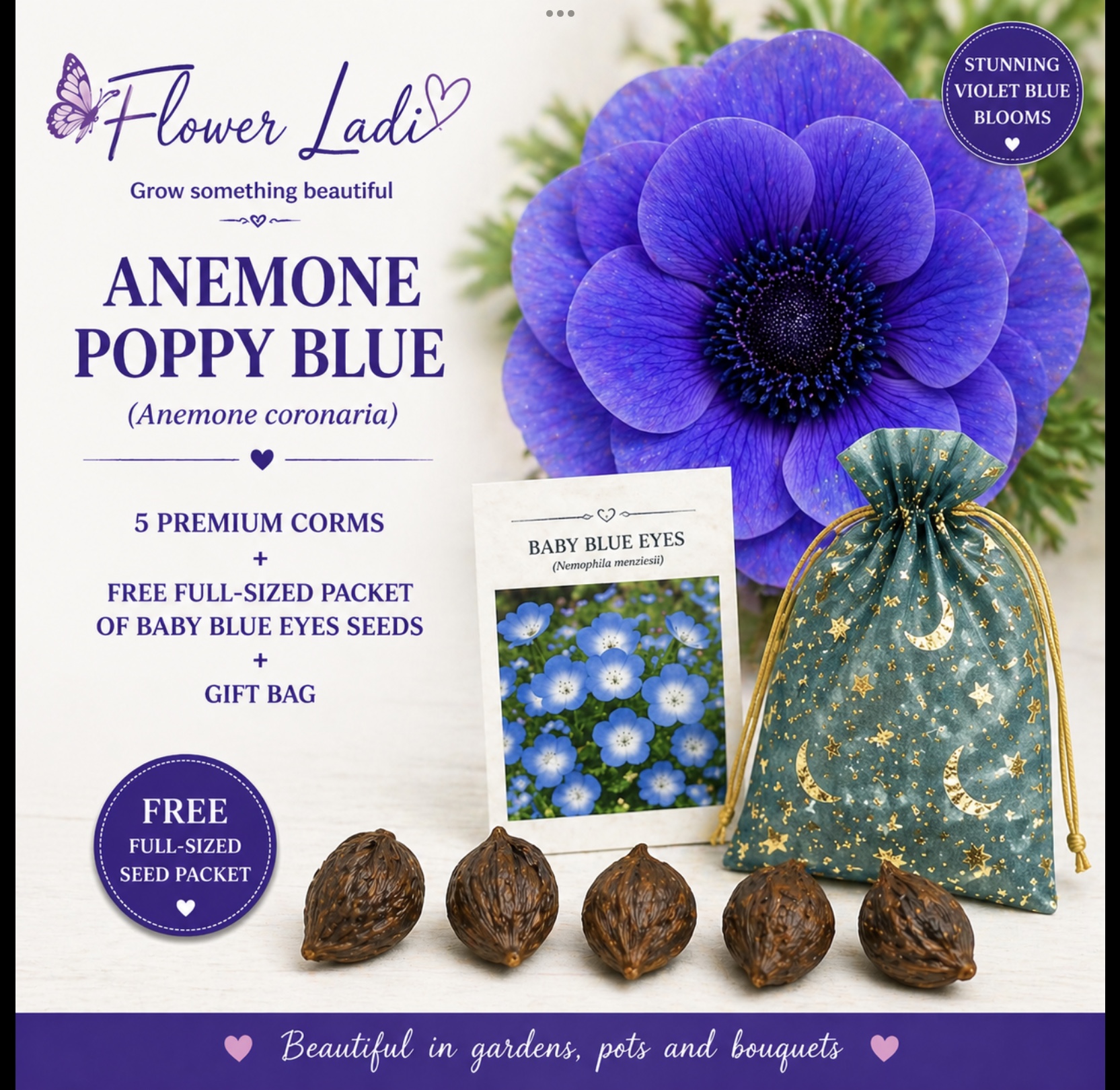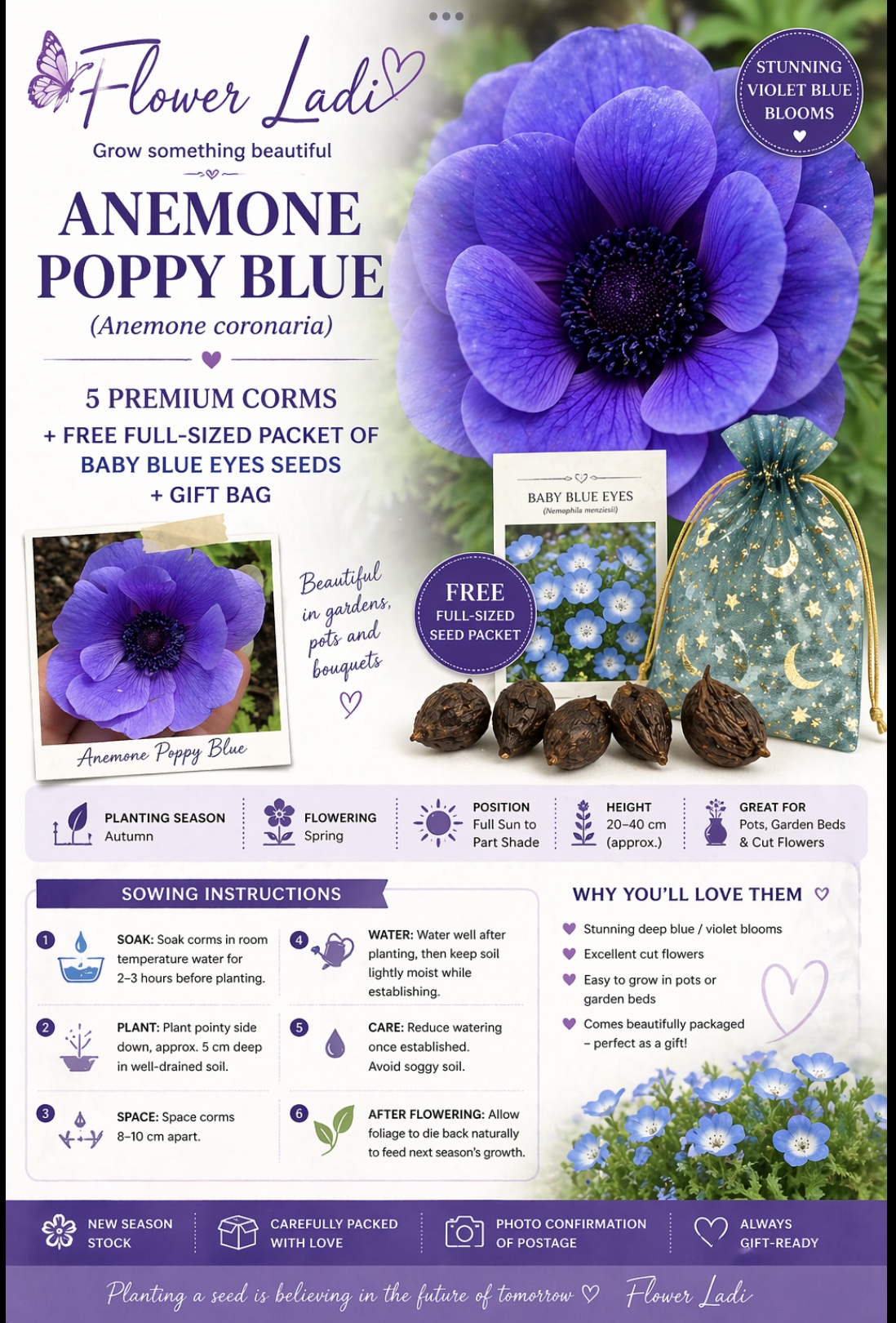 Add a touch of elegance to your garden with these beautiful Anemone Poppy Blue corms, producing striking deep violet-blue flowers that are simply breathtaking in full bloom 💜